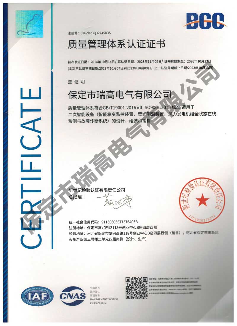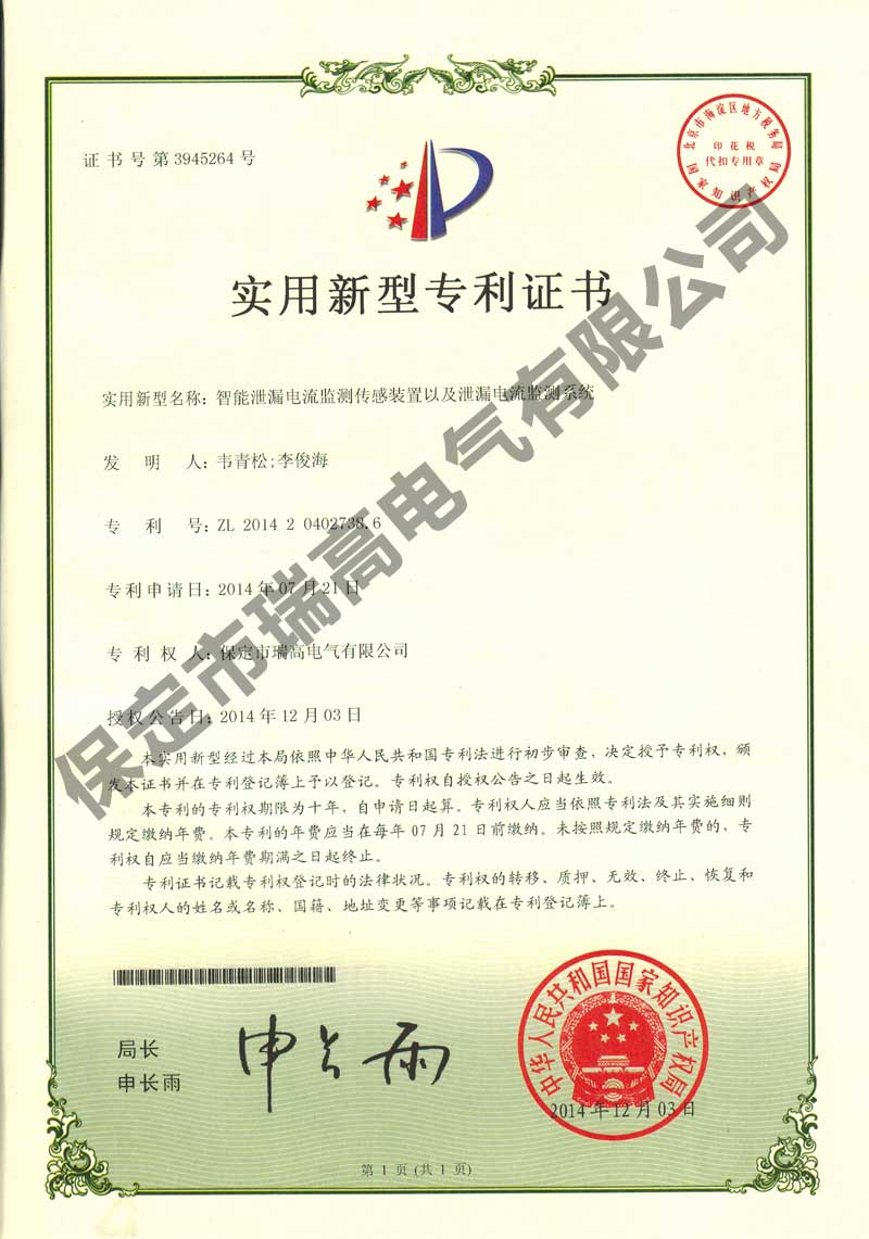 职业健康安全管理体系认证证书职业健康安全管理体系认证证书质量体系认证证书质量体系认证证书电池温度检测组件电池温度检测组件放电间隙放电间隙基于IGBT技术的分支可控智能汇流箱以及光伏系统基于IGBT技术的分支可控智能汇流箱以及光伏系统新型智能型变压器风冷控制柜实用新型专利证书新型智能型变压器风冷控制柜实用新型专利证书箱变智能监控系统箱变智能监控系统智能泄露电流监测传感装置以及泄露电流监测系统智能泄露电流监测传感装置以及泄露电流监测系统